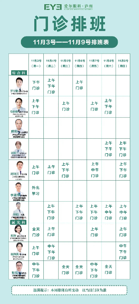 注: 排班可能稍有变动,请以门诊排班为准,可提前电话预约。